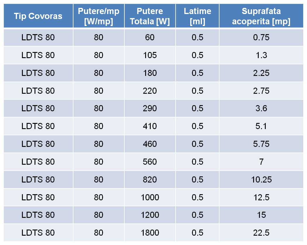 Covorasul incalzitor LDTS este realizat cu un cablu de tip bifilar (miez dublu conductor) foarte subtire cu ecran metalic, cu rezistenta constanta/ml, utilizat pentru incalzirea in pardoseala, potrivit pentru incaperi obisnuite - sunt ideale pentru fixarea cu adeziv direct sub placile ceramice. Este disponibil la rola intr-o gama larga de puteri si suprafete (vezi mai jos tabelul cu dimensiunile disponibile), permitand astfel o buna flexibilitate la montaj. Covorasele LDTS au pe suprafata inferioara doua benzi auto-adezive pentru fixarea de pardoseala. Diametrul cablului este cuprins intre 3.0 - 4.0 mm, iar alimentarea acestuia se face la un singur capat print-un cablu ''rece'' cu o lungime de 1x3m. Gradul ridicat de protectie IP 67 ii confera posibilitatea de a fi instalat chiar si in zone cu umiditate ridicata (bai). Garantia este de 10 ani, putand fi extinsa in anumite conditii pe durata de viata a pardoselei, fiind astfel sistemul de incalzire cu cea mai lunga durata de viata.