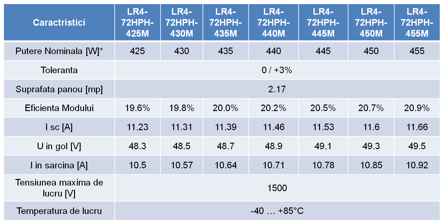 * - Valorile sunt valabile pentru: radiatie solara 1000W / m2 și temperatura celulei de +25ºC.